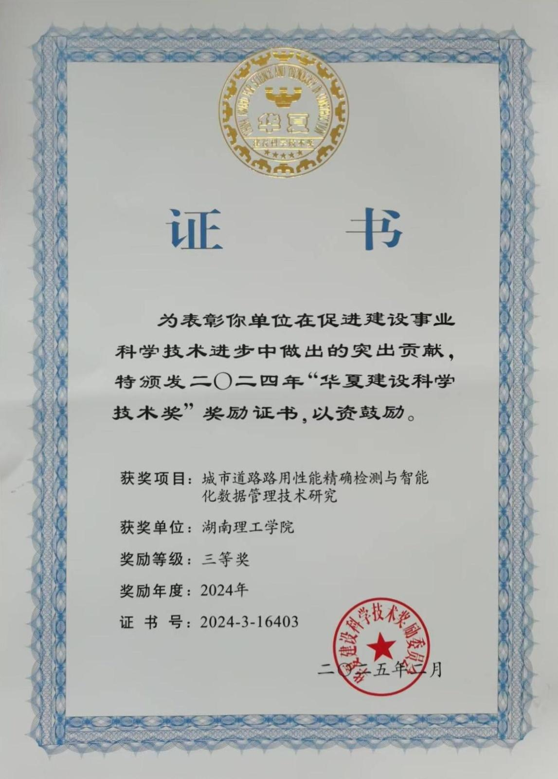 在华夏建设科学技术奖励委员会公布的2024年度科技奖授奖项目中,太阳成集团tyc33455cc童小龙教授、吴建良高级工程师作为主要完成人,其参与的《城市道路路用性能精确检...